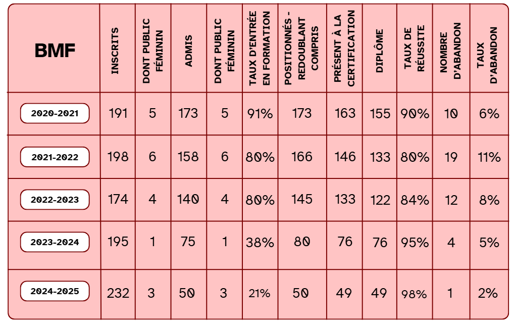 Pour le BMF – l’accompagnement de nos stagiaires porte ses fruits : après une nette amélioration sur la saison 23-24, un seul abandon et un taux de réussite presque plein à l’examen pour la dernière saison.