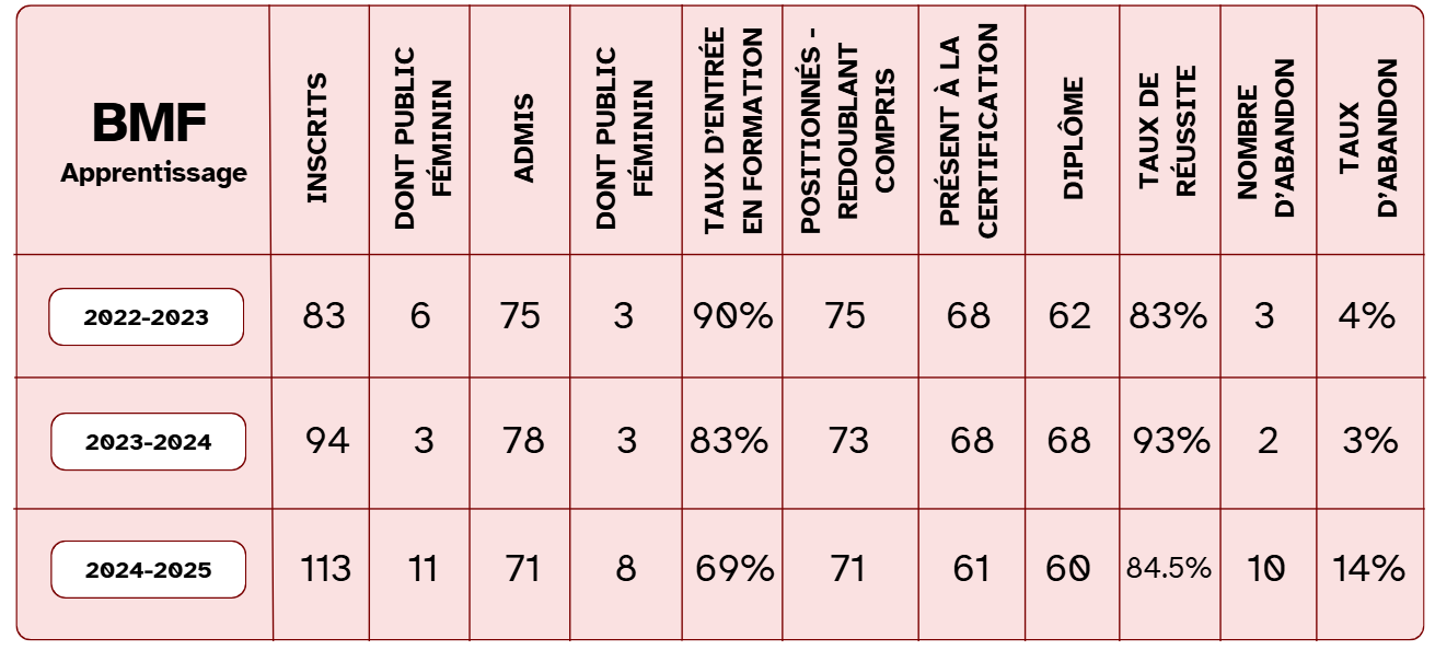 Pour le BMF – APPRENTISSAGE Saison 2024-2025 : taux de réussite à l’examen : 98% (stagiaires admis/stagiaires positionnés).