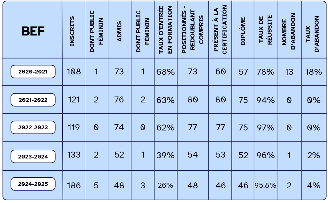 Pour le BEF – Saison 2024-2025 : le taux de réussite à l’examen est fort depuis plusieurs saison, et demeure très bon : 96% ; nous rencontrons par ailleurs toujours un très faible taux d’abandons (4%).
